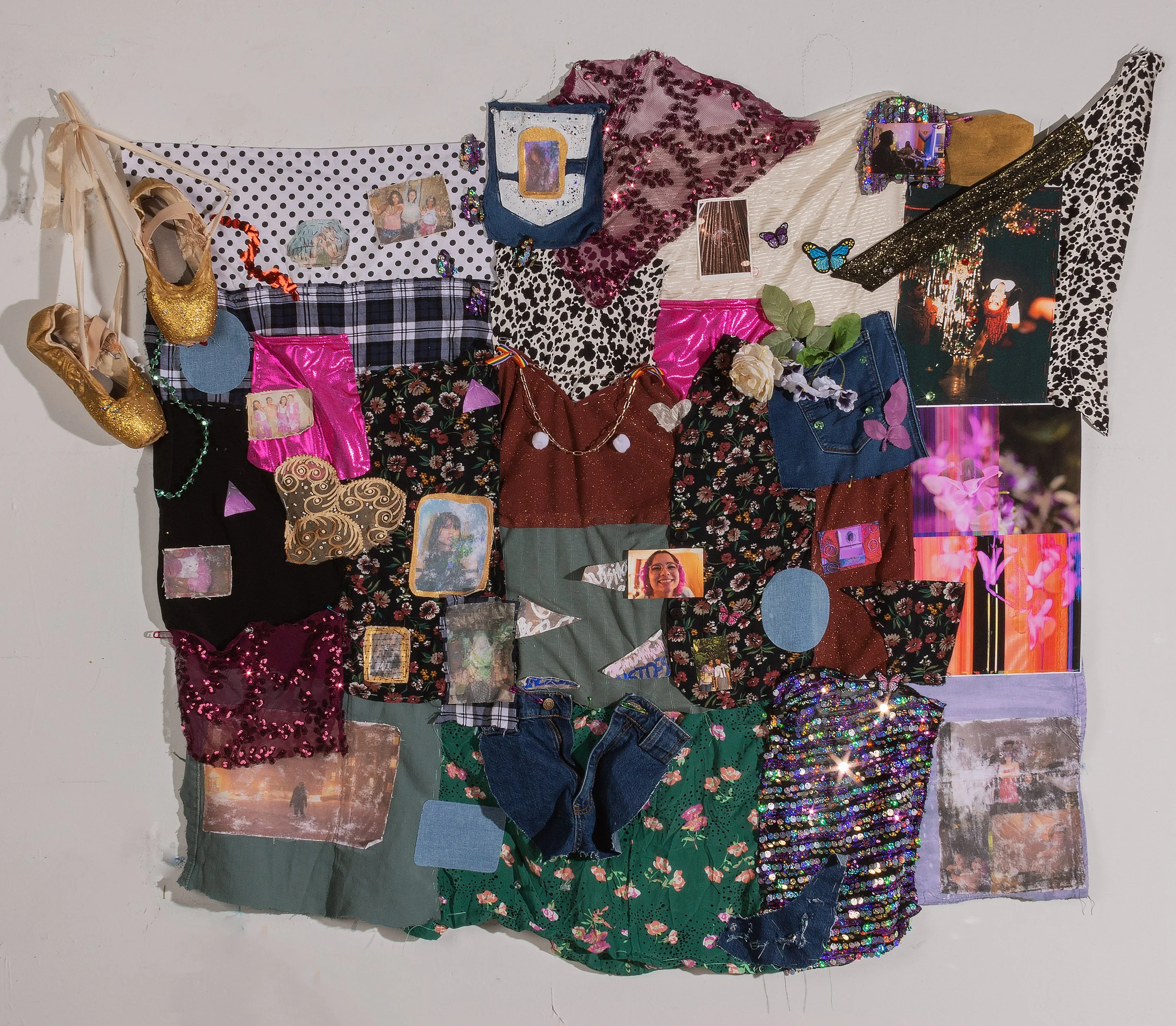 Through hand-sewing textiles, images and keepsakes, I crafted my own construction of gender, self-expression, and identity to illustrate how I present to the world, and how this will continue to change. There is an ever-evolving nature of understanding oneself and a hopeful resolution that remains. Queer voices and existences, including my own, are human and are worth celebrating: the quilt is an accumulation of my queer existence and the sense of joy, hope, and growth I have gained through learning about myself. I invite viewers to consider their own journeys and to think about it on their own terms.